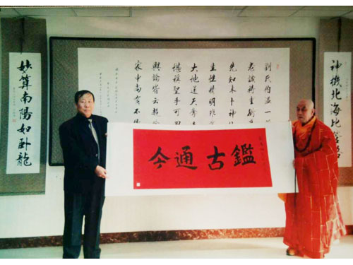 刘大师与得道大师合影,高僧圆山长老赠字